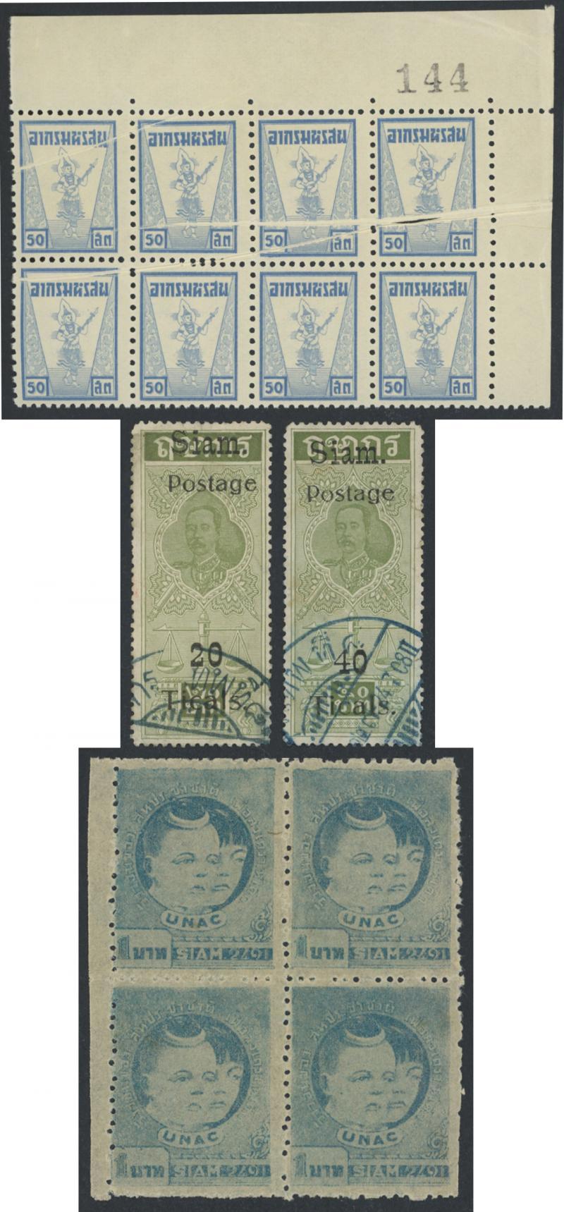 REVENUES: Selection with unused 1885 1t block of 9, Entertainment Tax 1954 50stg blue corner block of 8 with Major Pre-Printing Paper Folds **, Court Fee Tall Green Issue with Siamese Surcharge tropicalised but ** and 1907 High Denomination Postal Fiscals set postally used (Cat £1200; the 40t with small closed tear), Civil Defence 1942 Rouletted 20stg corner block of 12 and the huge Perf 1b corner example, UNAC 1948 1b block of 4, Ganesh large green issue block of 4, Red & Blue/White Issue marginal block of 9 the central unit in Red Only (Blue Omitted ?), generally very fine; plus six whole or part-documents in characteristically desiccated condition with a variety of frankings mostly from the Tall Green Court Fees issue but including one with Civil Defence small Yellow-Green and Purple stamps printed on the document.