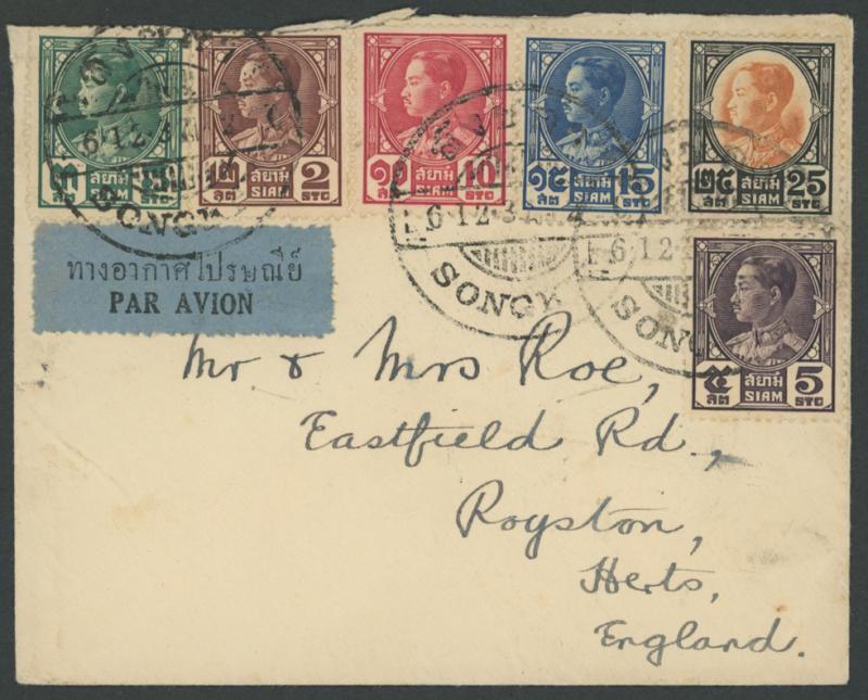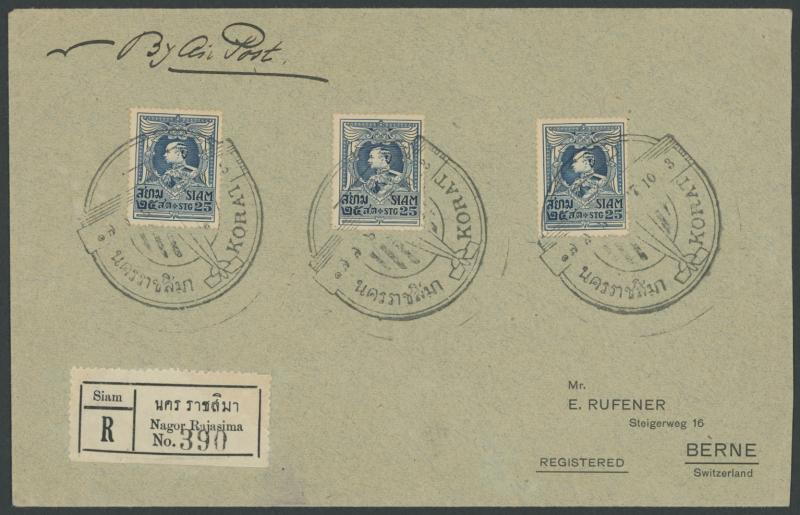 Philatelic covers comprising airmails 1923 Roi Etch-Bangkok; 1923 Ubol-Bangkok and Korat-Ubol both to Switzerland with red & black/white 'Ubon' or black/white 'Nagor Rajasima' R labels; and 1927 Roi Etch-Bangkok to Switzerland with red & black/white 'Roi Et' R label; 1947 Pan Am Bangkok-Manila and Bangkok-Honolulu; and 1910 three covers with values to 1tical tied by the huge UPU commemorative cds; generally very fine to superb.