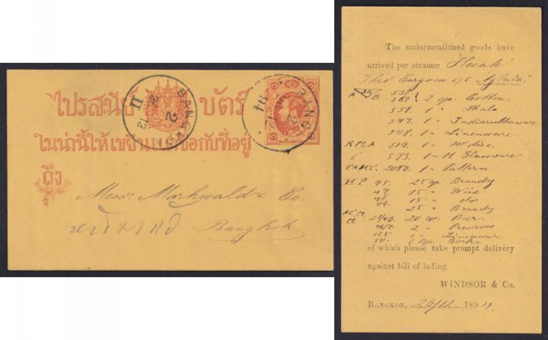 1894 (Dec 26) Postal Card King Chulalongkorn 1a orange/yellow with Windsor & Co printed message on reverse advising goods received by steamer including beer, wine & brandy, used locally with 'BANGKOK / 2 / II' cds, very fine. (Image1)