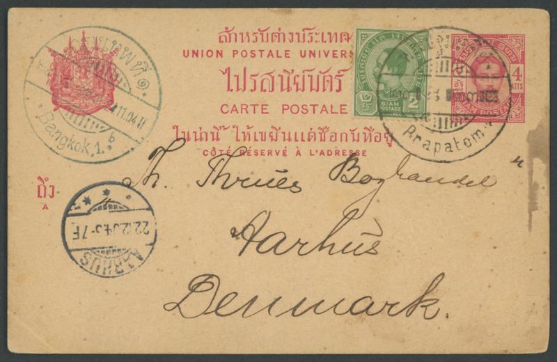 1904 (Nov 23) social usage of 4att Postal Card to Denmark with Sideface 2att green tied by bi-lingual '.../Prapatom' cds with Siamese date, Bangkok transit & 'AARHUS/22.12.04' arrival cds both on the face, minor stain at right & light corner bend at lower-left. Phra Pathom Chedi is the second-tallest Buddhist stupa in the world. It is situated at Nakhon Pathom, some 55km WNW of Bangkok. (Image1)