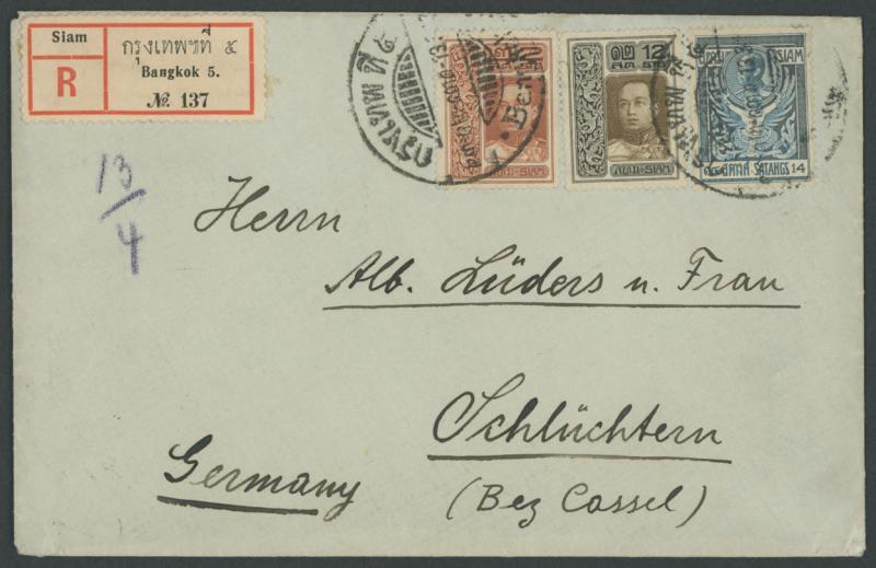 1913 (Mar 13) commercial cover to Germany with Two Issue franking of 1910 Garuda 14stg x3 (two on the reverse) plus 1912 Vajiravudh 2stg & 12stg tied by bi-lingual '.../Bangkok 5 a' cds, red & black/white 'Bangkok 5' R label, 'SCHLUCHTERN/11.4.13/(Bz CASSEL)' arrival backstamp. (Image1)