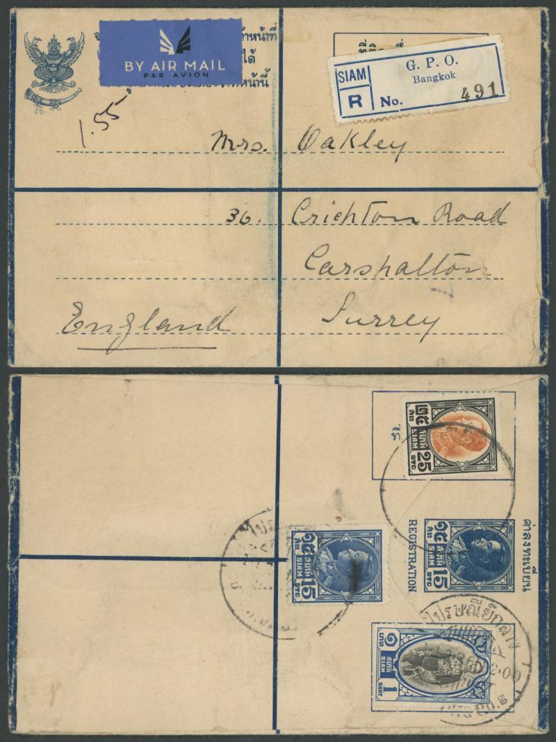1936 (Dec 1) usage of Registration Envelope Prajadhipok 15s blue airmail to England with Prajadhipok 15s blue, 25s orange & black and 1b black & blue added tied Bangkok cds, blue & black/white 'R' label on the face, some transmission marks & a little roughly opened. (Image1)
