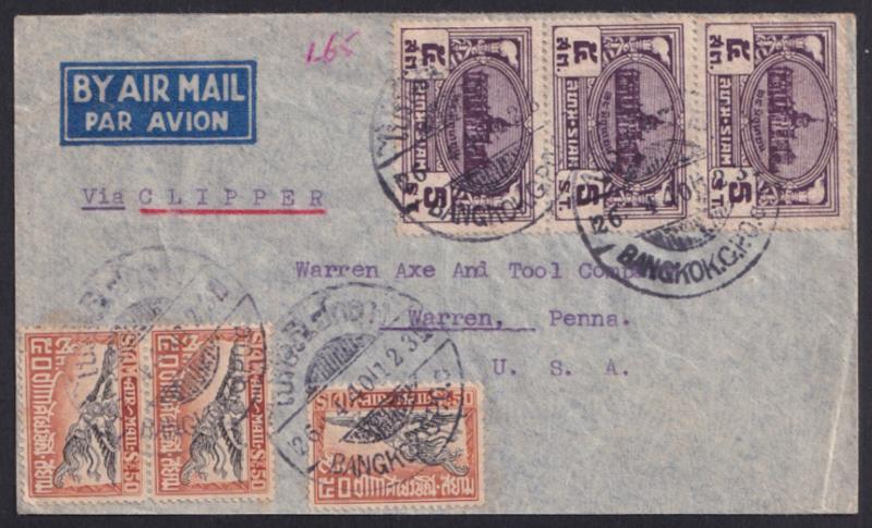 1940 (April 26) Henry Waugh & Co flimsy airmail envelope to Pennsylvania USA endorsed "Via Clipper" with Temple 5s strip of 3 & Airmail 50s x3 tied by Bangkok cds paying 165s per ½oz rate for carriage by Imperial Airways feeder service to Hong Kong and PanAm Pacific Clipper service. (Image1)