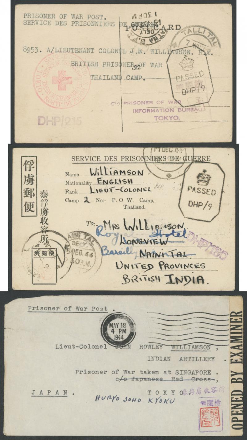 1942 (June 20) to 1945 (June 25) Japanese Occupation Chungkai (Camp Number 2) Prisoner of War Camp correspondence to or from Major (later Lt-Col) John Rowley Williamson at No 2 Camp comprising outwards postal cards x3, inwards postal cards or covers from India x4 (one taxed in India!) or Canada (with roneo'd message form), also two British Red Cross/St John advices & one covering envelope, on Lindsay Chitty's exhibit pages, generally fine to very fine.