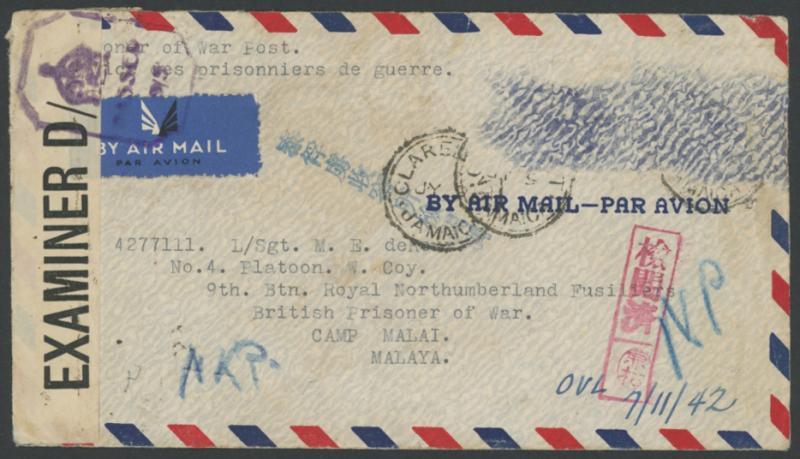1942 (July 9) Japanese Occupation Non Pladuk (Number 1) Prisoner of War Camp airmail cover from Jamaica (!) with double-circle 'CLAREMONT' cds (year slug omitted), to a British POW at "Camp Malai/Malaya" with censor 'D/ - ' label & '.../D5' cachet, no Japanese markings applied at Changi but with "OVL 7.11.42" (= sent overland on that date) in blue ink, Thailand censor & han of Kanematsu both in rosine, blue-pencil "NKP" (= Nakon Pathom) and "NP" (= Non Pladuk), stamps removed by the censor to check for a secret message, light soiling. An extraordinary origin/destination cover. (Image1)