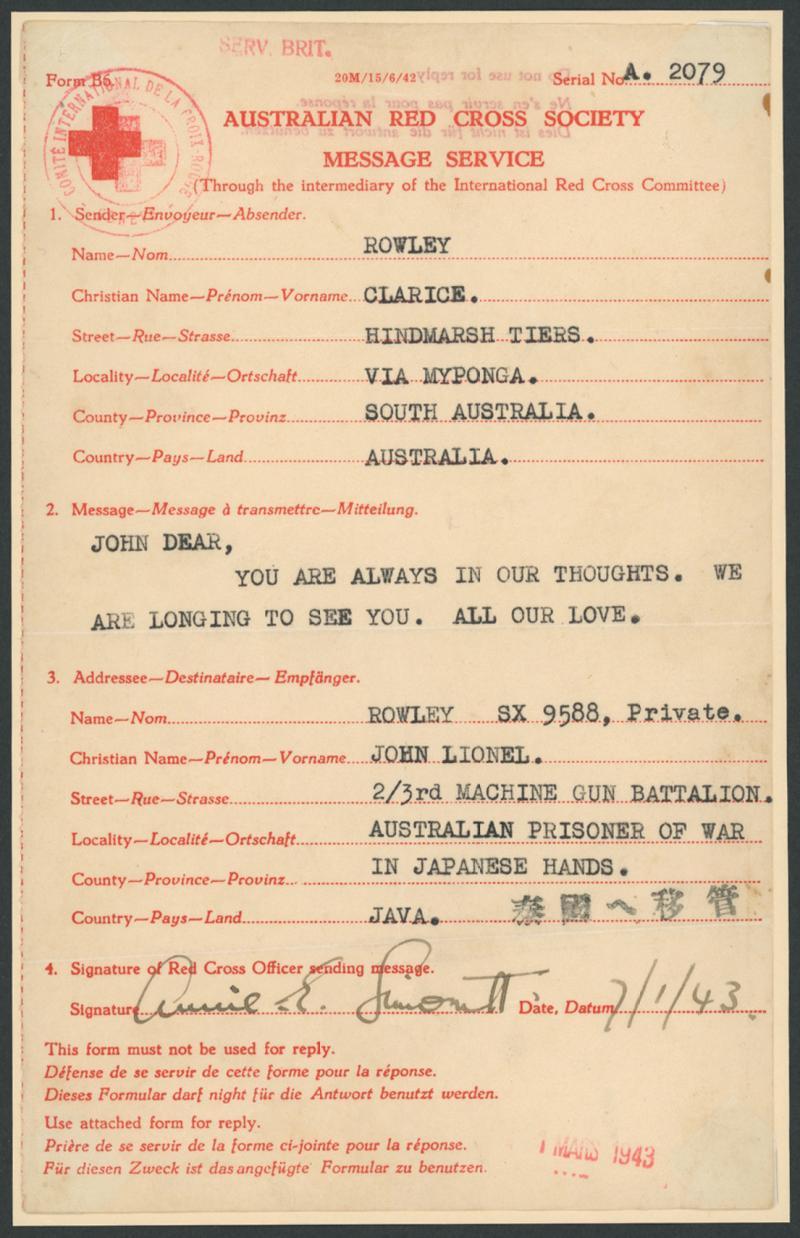 1943 (Jan 7) Australian Red Cross 'MESSAGE SERVICE' form from a wife in South Australia to her husband at "Java" via the Red Cross in Geneva with circular cachet & dater '1 MARS 1943' both in rosine, redirected with Japanese cachet translated as 'Transferred to Thailand', characteristic folds. Stated by Lindsay Chitty to be one of only two recorded examples from Australia to Thailand. (Image1)