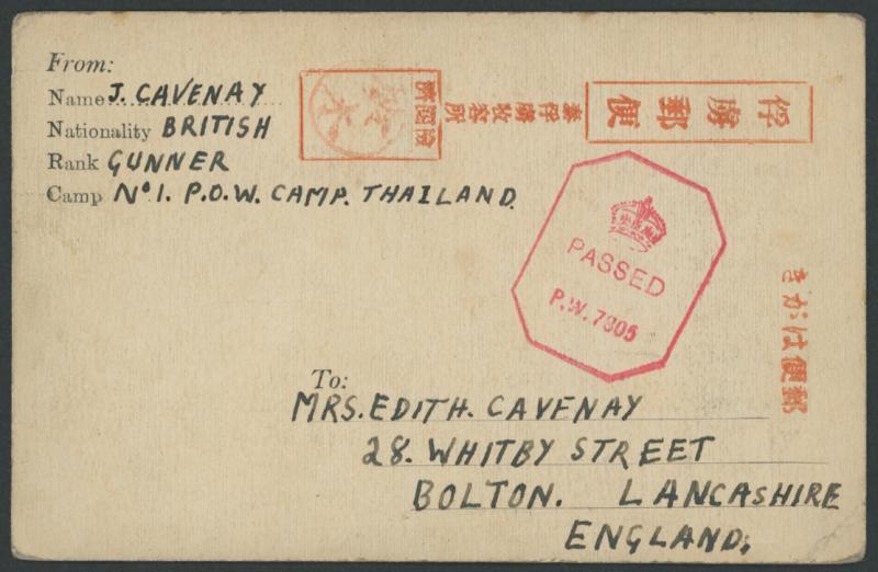 1943-44 four Japanese postal cards from British Gunner John Cavenay to England comprising 1) First Type with Four Characters in Red and very fine han of Kobayashi Kaoru in scarlet, faults, rare with David Tett having recorded only one other example; 2) Second or Third Type Printed in Black & Red from "No 1 POW Camp" with han of Suzuki in scarlet & superb British censor in rosine; 3) Fourth Type Printed in Black from 'No ("1") POW Camp' with camp cachet & han of Kanematsu both in rosine; and as the last but stated to be the Fifth Type from 'No ("3") POW Camp with superb han of Komai, central vertical fold. Camp 1 was at Non Pladuk & Camp 3 was at Niekei.