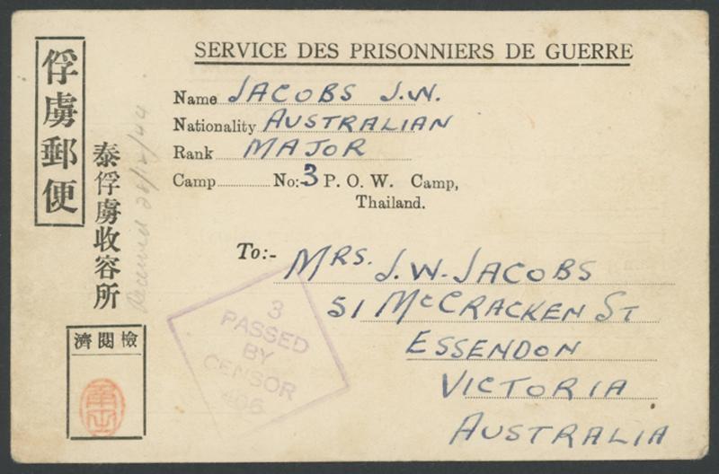 1944 Japanese Occupation Niekei (Number 3) Prisoner of War Camp undated Japanese POW postal card with printed 'Camp...No ("3") POW Camp/Thailand", from an Australian officer, very fine han of Sumita and Melbourne censor in violet. (Image1)