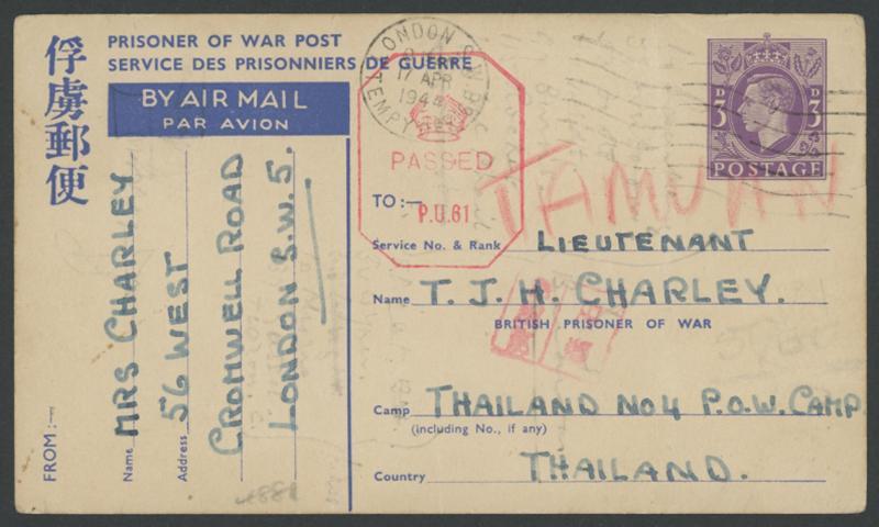 1944 (Apr 17) Japanese Occupation Tamuang (Number 4) Prisoner of War Camp British 3d POW Airmail Postal Card from London with British censor in rosine, to "Thailand No 4 POW Camp" endorsed "Tamuan" in red pencil, han of Ishikura in rosine. Lindsay Chitty states it is likely that Lt Charley actually received this at the Kanchanaburi Officers' Camp. (Image1)