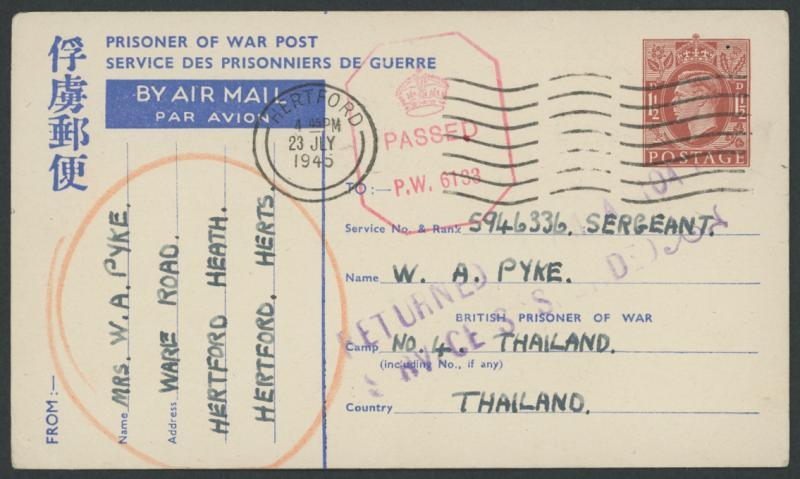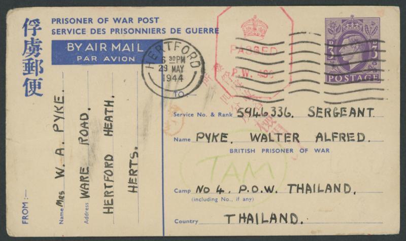 1944 (May 29) British 3d POW Airmail Postal Card from Hertford with British censor in rosine, to "No 4 POW Camp Thailand" endorsed "Tam" (Tamuang) in green pencil, Japanese censor cachet in rosine & han of Ishikura in scarlet. (Image1)