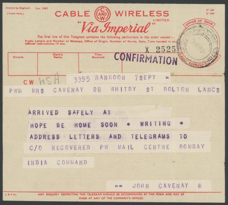 1945 (Aug 30) Japanese Occupation Prisoner of War Camps makeshift envelope with letter headed ".../Royal Artillery/Prisoner of War/Thailand", to Lancashire with faint Indian-pattern censor '127' cachet in violet applied at Rangoon & secured in transit with a small piece of British resealing tape, a bit banged-up. The writer states "... We are in a compound 20km from Bangkok. The people in Siam are being very good to us ...". Plus the telegram he sent from Rangoon and covering roneo'd letter advising the telegram was sent free of charge, and that the same privilege would be afforded for a reply.