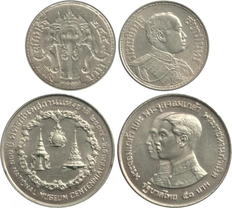 Silver group comprising baht 1916 (BE2459) Rama VI KM Y45 (6) including Full Moon, Waxing Moon, & Waning Moon in reverse text; and 50 baht 1974 National Museum Centenary KM Y101 (4); condition variable, EF-Unc.