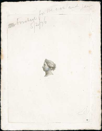 Waterlow & Sons. 1876 QV Head progressive die proof in black, die sunk on thin white card, 75x97mm, "R.C.B.S" handstamped on reverse, endorsed and dated in pencil "touched for the ear and jaw 5/2/76". This head was later used for the Queensland 2d essay submitted by Waterlows for the 1879 tender. A unique proof, ex Clive, Gilbert and Chartwell Collections. Photo on Page 26. (Image1)
