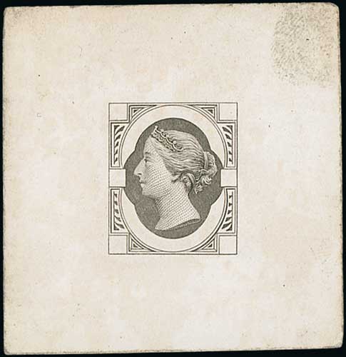 Head die C (Empress head) by William Theed, Die Proof in black with rectangular lined background (for frame D) within an uncleared border, on white glazed card, 92x60mm. S.G. £2,000. Photo on Page 22. (Image1)