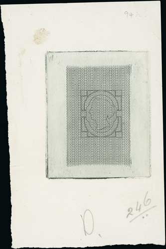 Small Head die proof by Ridgeway, state I with weak diadem details in lilac, vertical oval background of horizontal bars and uncleared surround, die sunk on wove paper, 68x74mm. Photo on Page 114. (Image1)