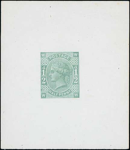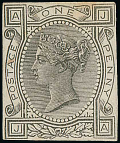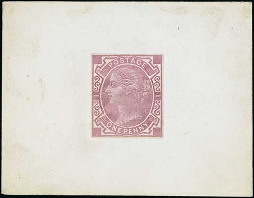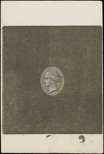 Head die A by William Theed, Die Proof in black with rectangular lined background (for frame D) within an uncleared border, on white glazed card, 92x60mm. S.G. £2,000. Photo on Page 22. (Image1)