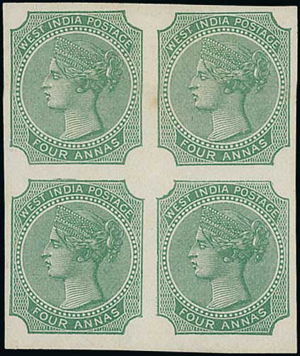 McCorquodale & Co. Imperforate "West India Postage / Four Annas" dummy stamps based on the 1866 De La Rue East India 4a stamp, in shades of green (3), blue (5), brown (9) or carmine-rose (25) on various gummed or ungummed papers, including blocks of four (8) and strips of four (2); also a block of six of the 1866 East India die I 4a green each with "CANCELLED" overprint. An uncommon group; two sheets of these dummy stamps were submitted for the 1879 Tender. (52). Photo on Page 16. (Image1)
