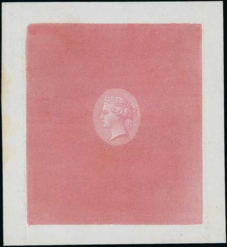 Head die A by William Theed, Die Proof in carmine with circular lined background (for frame B) within an uncleared circular band, on white glazed card, 92x60mm. S.G. £2,000. Photo on Page 22. (Image1)