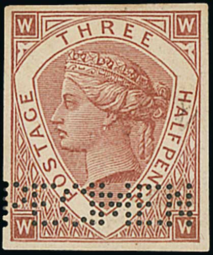 Imperforate ½d Brown, 1½d brown, 2d pink (frame K) and 2d blue (frame A) essays each perfined "SPECIMEN" (Samuel type P2, recorded "from c.1900", these examples over 20 years earlier), on wove paper, each endorsed on reverse "surface ptd" and numbered "6" (1½d), "7" (½d), "8" (2d pink) or "9" (2d blue) with violet oval handstamp "PERKINS, BACON & CO LIMITED / ENGRAVERS / 69 FLEET ST., LONDON". A unique group from the Perkins Bacon archive purchased by Harry Nissen. (4). Photo included on Front Cover. (Image1)