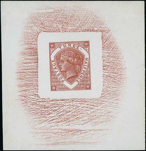 1½d Die proof in brown, frame G, partly cleared background around the stamp, on wove paper, 67x70mm, fine and unusual. Ex Fisher and O'Connor Collections. Photo on Page 15. (Image1)