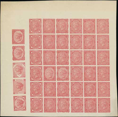 ½d-2d Essays, imperforate proof sheet from plate VI printed in red on gummed wove paper, comprising the original 1879 1d plate IV (6x6, frames A-F) with a vertical strip of five essays added at the left comprising ½d type B, 2d type C, 1½d type G, 2d type H and 2d type A, the two sections not aligned, fine and scarce, 182x180mm. Photo on Page 15. (Image1)