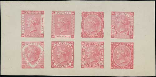 Plate X Imperforate essay proof sheetlet of eight in pink, two rows of four with 6mm horizontal and 3mm vertical gutters, row 1 comprising 2d frame J + 2d frame H + 2d frame C + 1½d frame K, row 2 comprising 1½d frame G + 2d frame A + ½d frame I + ½d frame B, on watermarked wove paper. Also row 1 strip of four in blue (heavy fold to first stamp) and single essays in blue (2) and brown (5). The sheet fine and scarce, ex. Fisher collection. (19). Photo on Page 20. (Image1)