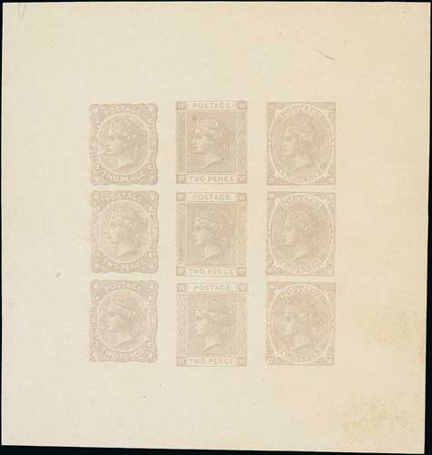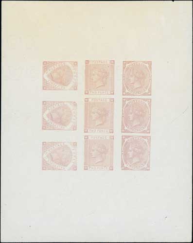 Plate XIa Imperforate 2d essay proof sheet of nine, similar to the plate XI sheet but the three sideways 1½d essays replaced by three upright 2d frame C essays, in pale purple-brown on wove paper, 115x122mm. Minor marginal toning, otherwise fine and the only recorded plate X1a sheet, ex Young Collection. Photo on Page 16. (Image1)