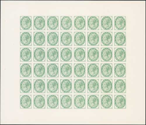 Perkins Bacon & Co. Imperforate 1d small head essay proof block of 36 with blank corners in green, from the new plate V (120 stamps) made in May or June 1879, on white wove paper, lower row with part paper makers watermark "L POSTAGE PAPER".