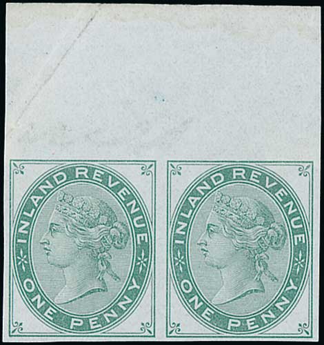 Inland Revenue 1d, imperforate proofs on gummed Anchor watermarked paper, upper marginal pair in green, upper marginal singles in blue (2, previously a pair) or brown, and singles in red or green, partial "W.H Stephenson" and "Inland Revenue" watermarks in upper margins. Specimens for ink fugacity were submitted as part of the 1879 Tender. S.G. £2,100. (7). Photo on Page 104. (Image1)