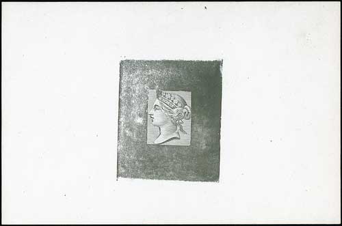 Small Head die proof by Ridgeway, state II with strengthened diadem details, vertical oval background of horizontal lines and uncleared background in black on card, 61x81mm, fine and scarce. Photo on Page 26. (Image1)