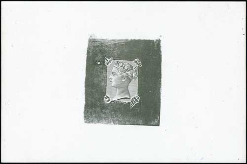 Head die B by Joubert, Die Proof in black with rectangular lined background modified at the corners (for frame F) within an uncleared border, on white glazed card, 92x60mm. This head die was adopted for the issued stamps. S.G. £2,000. Photo on Page 22. (Image1)