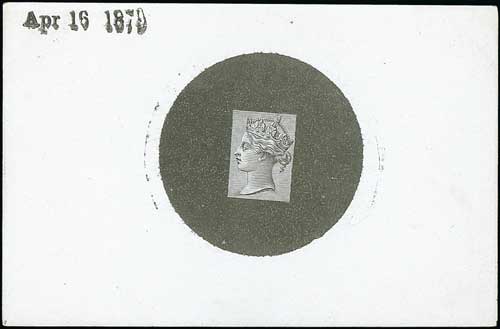 Head die D (Empress head) by Joubert, Die Proof in black with rectangular lined background (for frame D) within an uncleared circle, on white glazed card dated "Apr 16 1879", 92x60mm. S.G. £2,000. Photo on Page 22. (Image1)