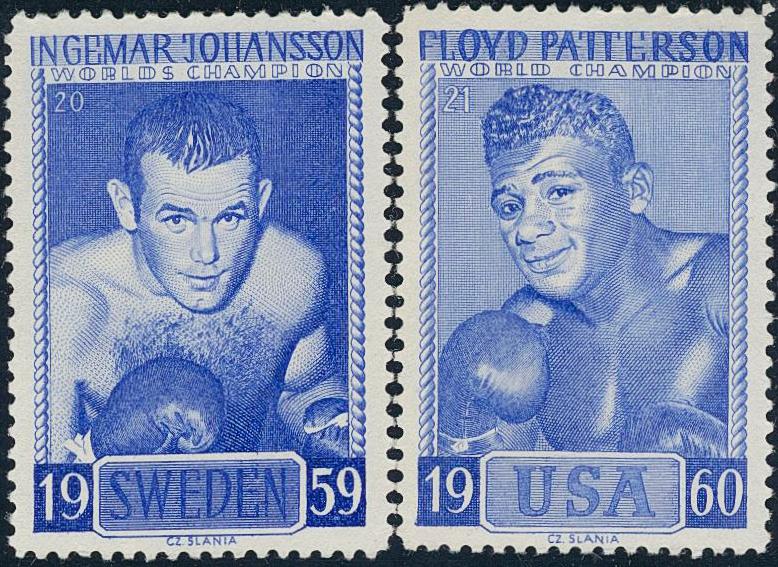 Slania, Michel **, Boxers Ingemar Johansson and Floyd Patterson, the 1970s plastic plate test, printed in blue colour. Light crease upper right on Floyd. (Image1)