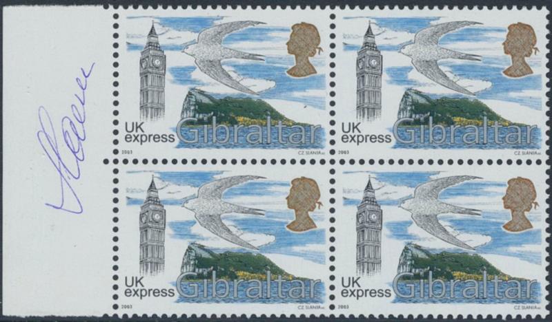 Slania, Gibraltar + New Zealand, Michel **, 2003 Express (£3) in block of four with margin signed "Slania" + New Zealand $20. Both engraved by Slania. 1 more image is available at www.philea.se. (Image1)