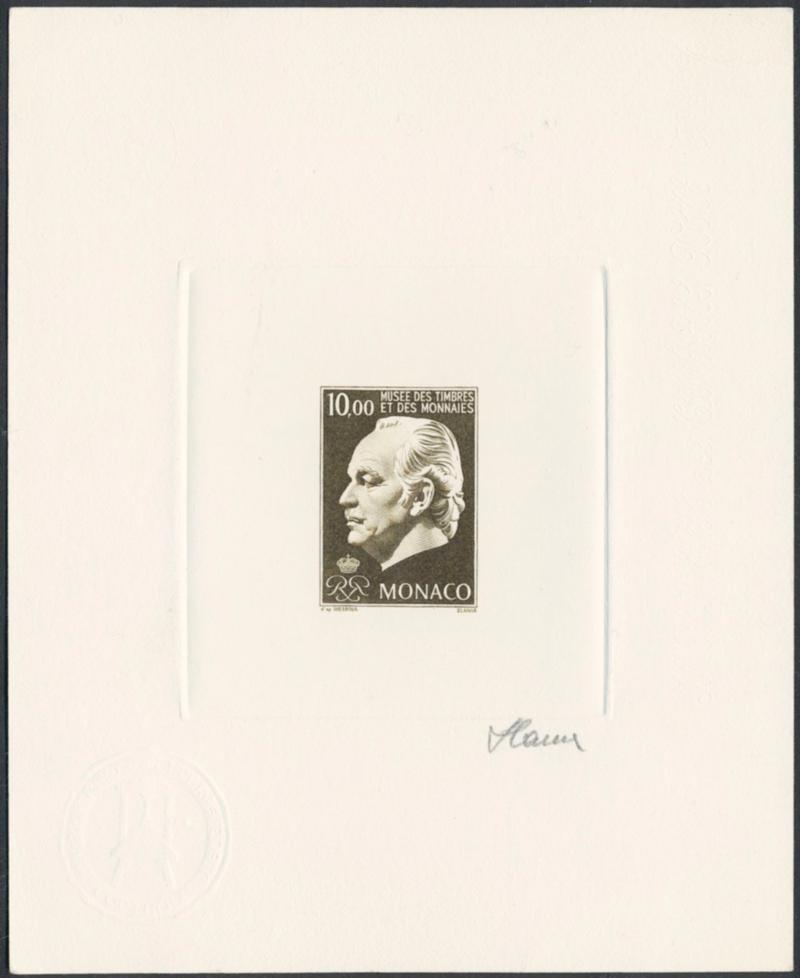 Slania, Monaco, Michel 2284 (*), 1996 Royal portraits exhibition 10 Fr violet. Plate proof in brown, signed 'Slania'. (Image1)