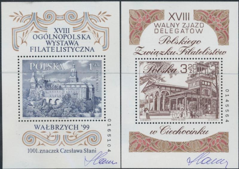Slania, Poland, Michel **, 1999 18th National Stamp Exhibition Souvenir sheet perforated + 2002 18th Congress for Polish Philatelist Society souvenir sheet perforated. Both signed by "Slania". (Image1)