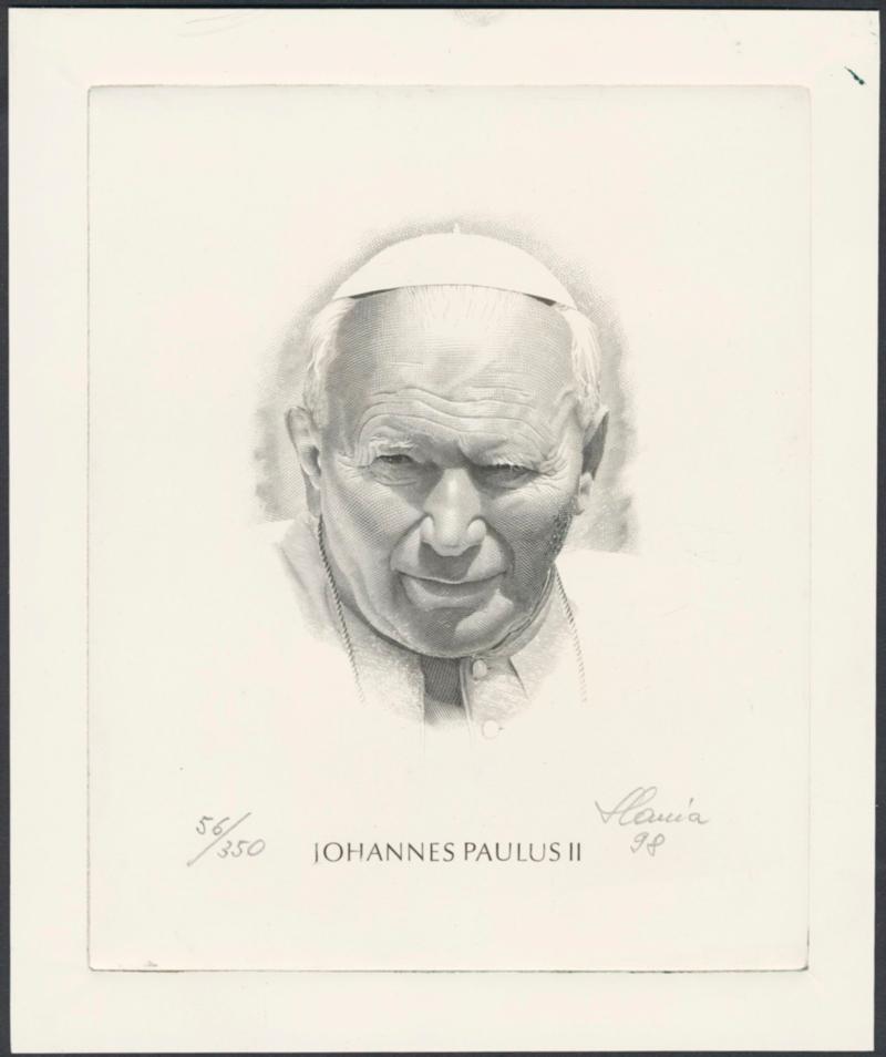 Slania, Poland, Michel (*), 'JOHANNES PAULUS II'. Steel engraving (1998) in greyish-black. Signed '56/350' and 'Slania 98'. Exquisite engraving! (Image1)