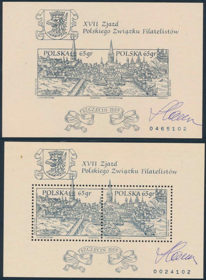 Slania, Poland, Michel 3724–25A **, 1998 17th Philatelic Congress Souvenir sheet perforated and imperforated. Both signed "Slania". (Image1)
