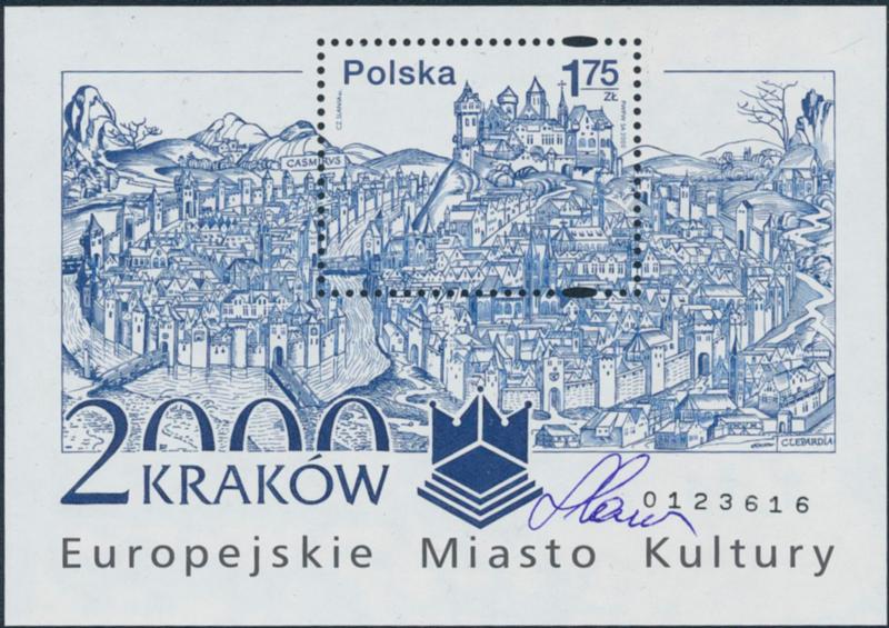 Slania, Poland, Michel 3827 **, 2000 Kraków – European Capital of Culture 2000 souvenir sheet 140A perforated signed "Slania". (Image1)