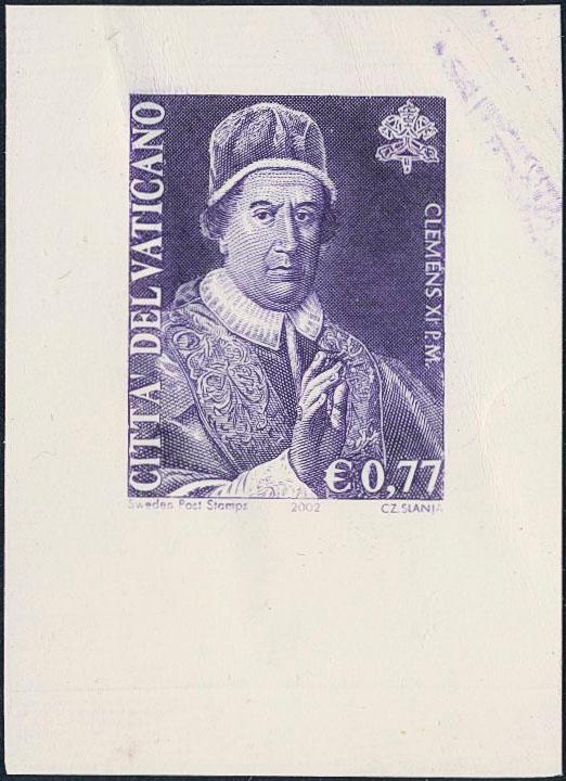 Slania, Vatikanstaten, Michel 1404 (*), 2002 Clemens XI 0,77 € violett. Plate proof (natural folds and fingerprint on back due to printing process). (Image1)