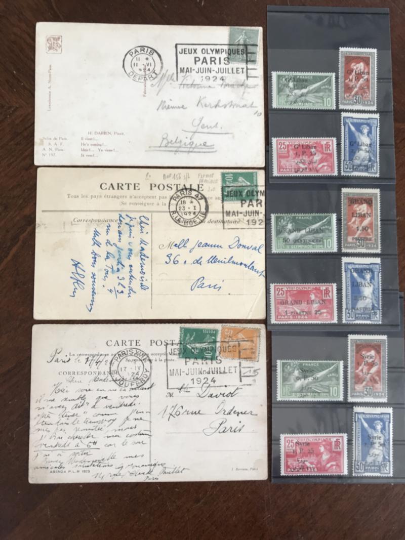 Thematics, Olympics., * Lot with Syria Mi227-30, Lebanon Mi22-25 and 53-56 + three postcards France with Olympic cancellations. The entire lot is presented at www.philea.se. (Image1)