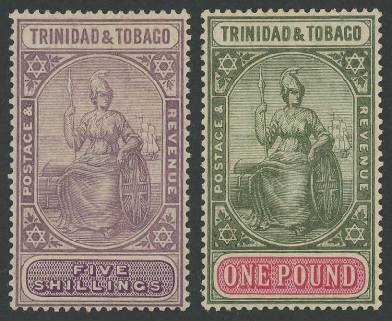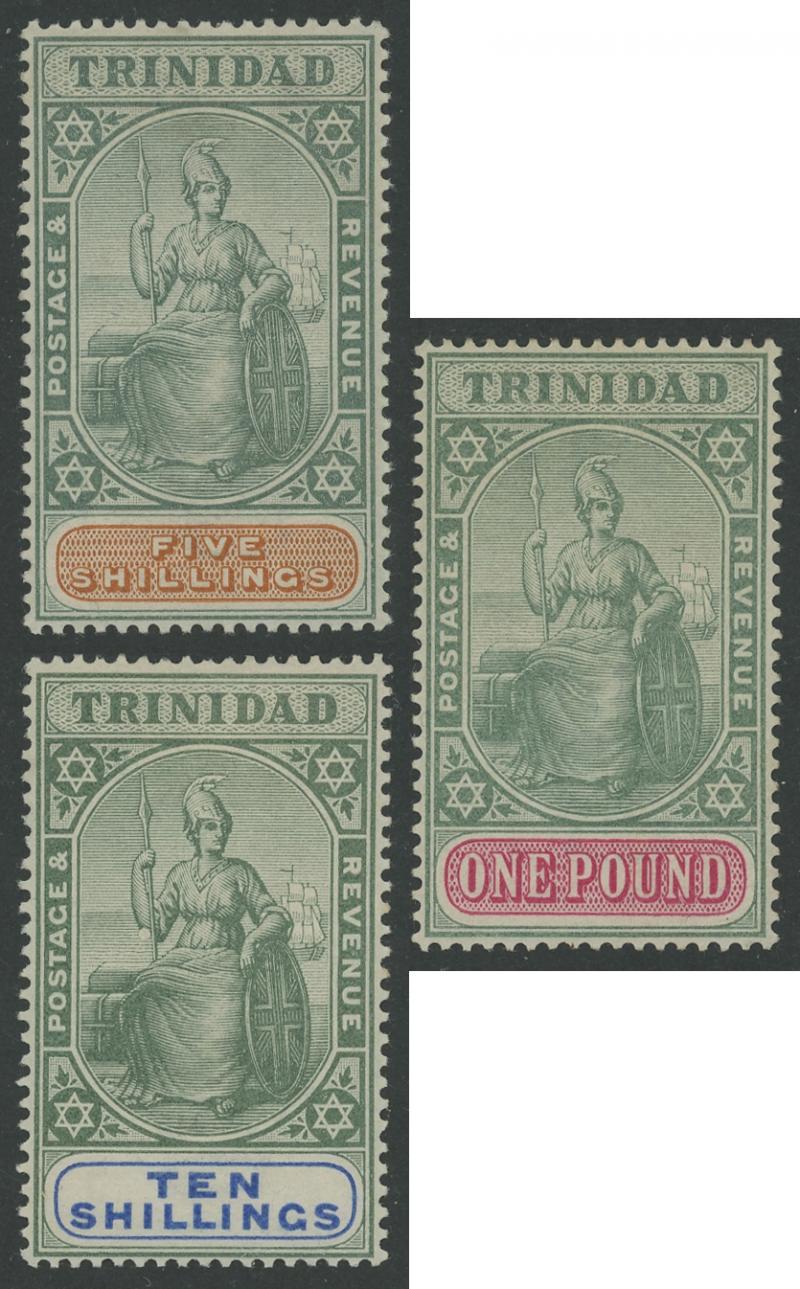 TRINIDAD: 1896-1906 Britannia Crown CA Watermark 5/- green & brown, 10/- green & ultramarine and £1 green & carmine Ordinary Paper SG 122-124, the 5/- apparently unmounted, the others with small hinge remainders, Cat £590+ for mounted. (3) (Image1)