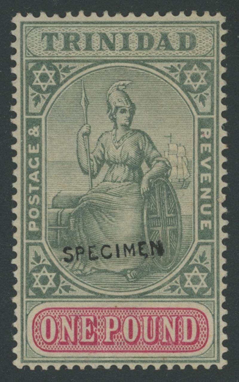TRINIDAD: 1896-1906 Britannia Crown CA Watermark £1 green & carmine on Chalk-Surfaced Paper SG 124a with small sans-serif 'SPECIMEN' handstamp (11 x 1½ mm; Samuel Type D9a) in black, quite well-centred, lightly mounted with a few tiny marks on the gum. Gibbons do not list non-UPU specimens. See the previous Lot for further information from Marcus Samuel's 'Specimen Stamps of the Crown Colonies' and 'The De La Rue Collection' edited by Frank Walton. (Image1)