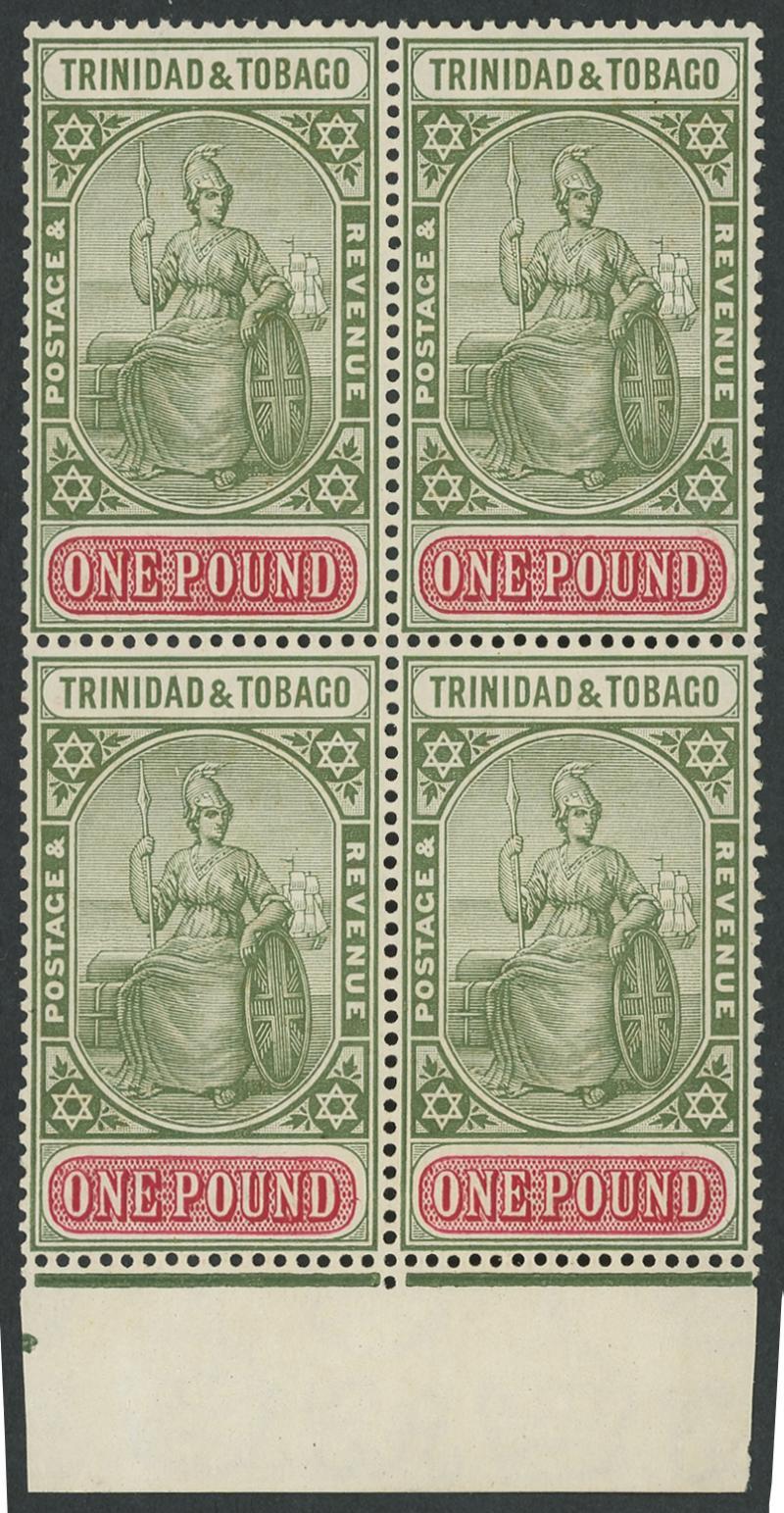 1921-22 Britannia Multiple Script CA Watermark £1 green & carmine SG 215 marginal block of 4 from the base of the sheet, very well-centred, light gum tropicalisation, unmounted, Cat £720+ for singles. A handsome block. (Image1)