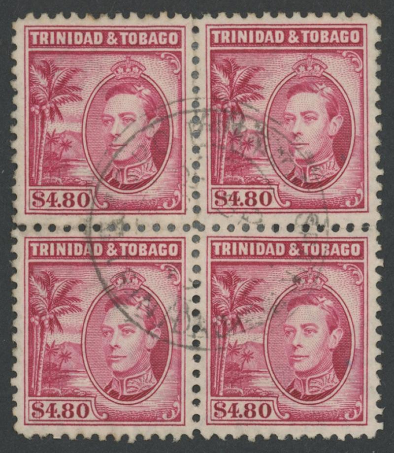1938-44 KGVI Pictorials $4.80 rose-carmine SG 256 block of 4, well-centred, postally used with light central Port of Spain cds cancel, Cat £240+ for singles. (Image1)
