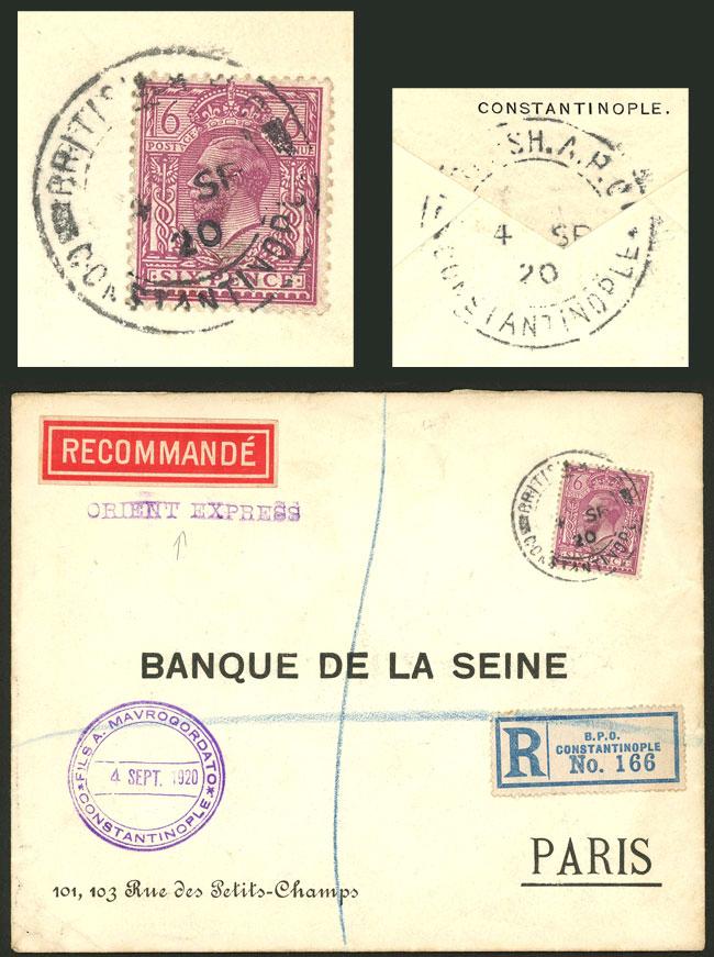 image 4/SE/1920 Constantinople to France, registered cover franked with British stamp of 6p., very fine quality! (Image)