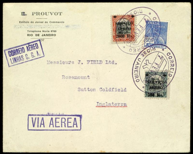 BRASILIEN 1929, attraktiver Flugbrief ab Rio de Janeiro 7.2.29 mit AÉROPOSTALE nach Sutton Coldfield, rs. farbige Vignette "CORREIO AEREO LINHAS C.G.A." (Image 1)(Image)
