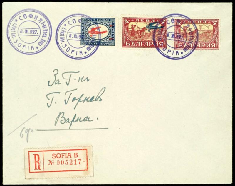 Bulgaria 1927, first flight Sofia - Varna, registered letter with flight stamp 8.11.27 and colourful mixed franking to Varna, reverse arrival, superb