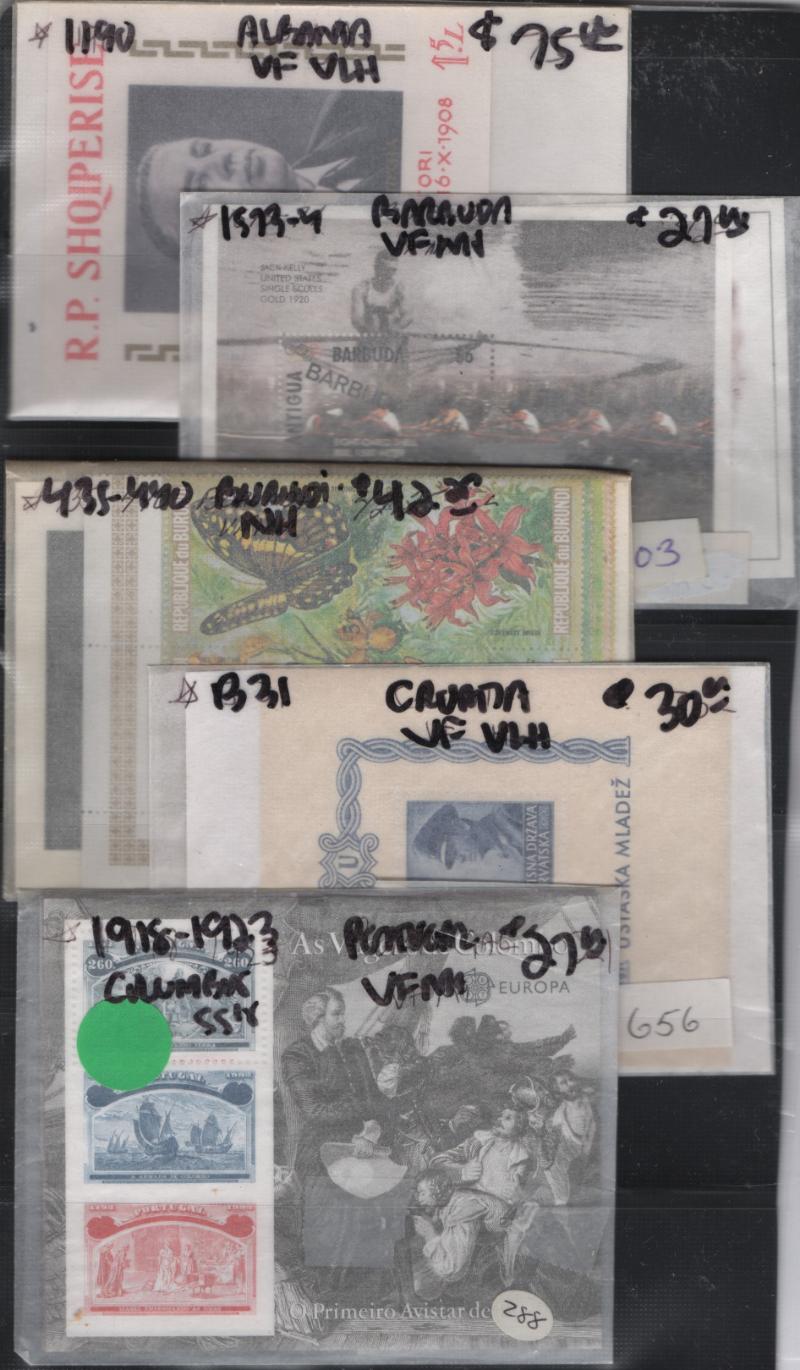 SOUVENIR SHEETS Accum abt (500), many have stamp sets incl Unused: Albania #1190, Barbuda 1371, 1565, 1573-74, Burundi 435-40, Cambodia 984, 1283, Croatia B31, Faroe Is 569a, Ireland 326a (3), Jordan 462, 534k, Mali 603, Romania B178a, Sweden 1948A, Yemen 136, Zaire 901 & Used Switz B144, much more; owner's CV $4,200 (NV); gen F-VF NH (Image)