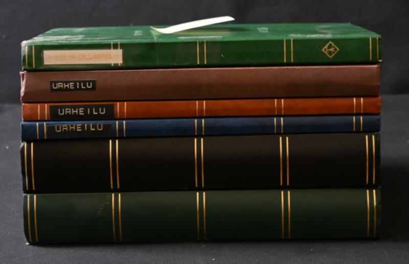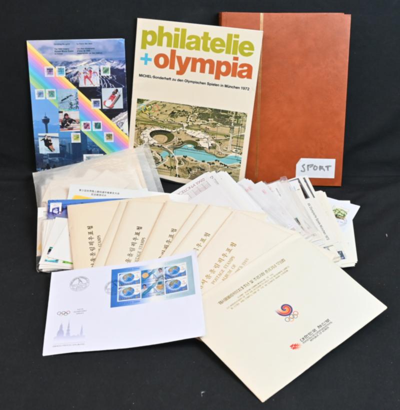 Sports, fine collection in 11 albums, plenty of stamps including plenty of Olympics theme, stamps, sets, miniature sheets, postal stationeries, special postmarks etc. neatly mounted on pages by sport. Including also better issues like Austria FIS sets Mi 551-554 * and 623-626 **, medium priced sets eg. from China etc. One album with also other material like issues related to camping. A meticulously assembled collection over the years with a substantial amount of high quality material! (Image)